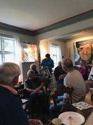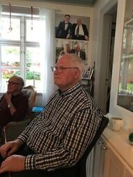 Glans kastet og president Arne over datter og far da han med bokgaver takket for gode historier og utmerket traktering. Det var en smakfull blåbærkake som ble servert. Når vi så også fikk høre at det gjennom året ble servert 4000 kopper kaffe på gården, forstår vi at gjestfriheten er stor på Grande Gaard. Ikke minst må nok dette tilskrives Martha, Annes mor som beskjedent hadde «gjemt» seg på kjøkkenet –som telefonvakt!