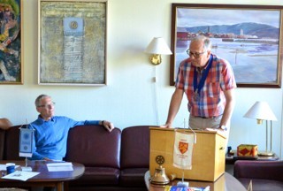 Så er det Steinar, klubbens kasserer gjennom mange år. Du har laget oversiktlige regnskaper hele tiden, og jeg tror ikke at vår revisor, Ivar, har hatt mange anmerkning til ditt arbeide. Greie oversikter over hva vi betaler til Rotary sentralt har du laget. Jobben du har gjort står det stor respekt av. Derfor er jeg stolt over å kunne gi deg nål og diplom som viser at du er en PHF, gratulere.