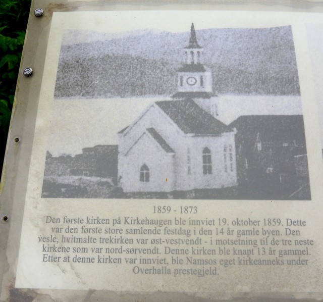 De fire kirkene på Kirkehaugen Hele fire kirker har i byens historie prydet bysenterets høyeste punkt. Den første kirka ble innviet i 1859. Den nåværende kirka, "Langskip", er det kirkebygget som har hatt lengst liv av de fire kirkene. En bildetavle som viser kirkehistoria i Namsos bysenter i korte drag, er plasseres ved kirkens hovedinngang.